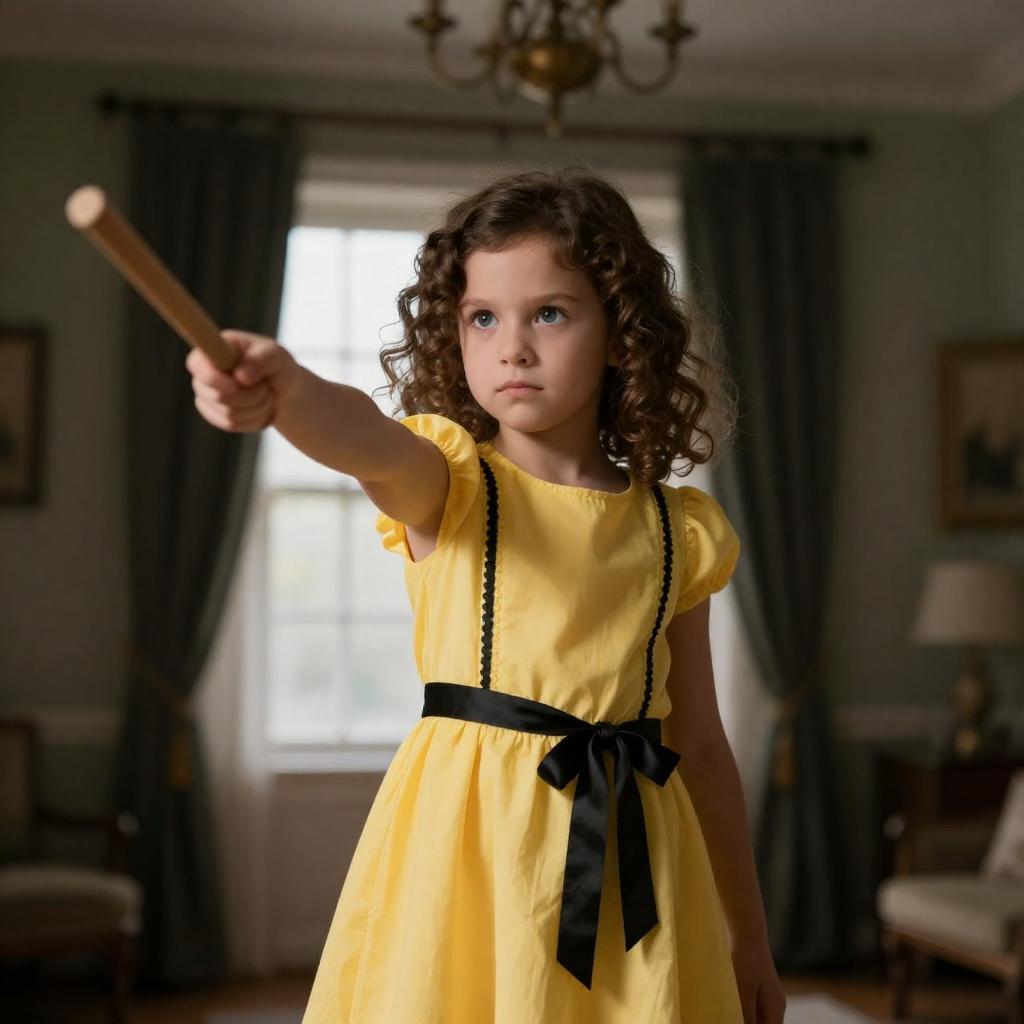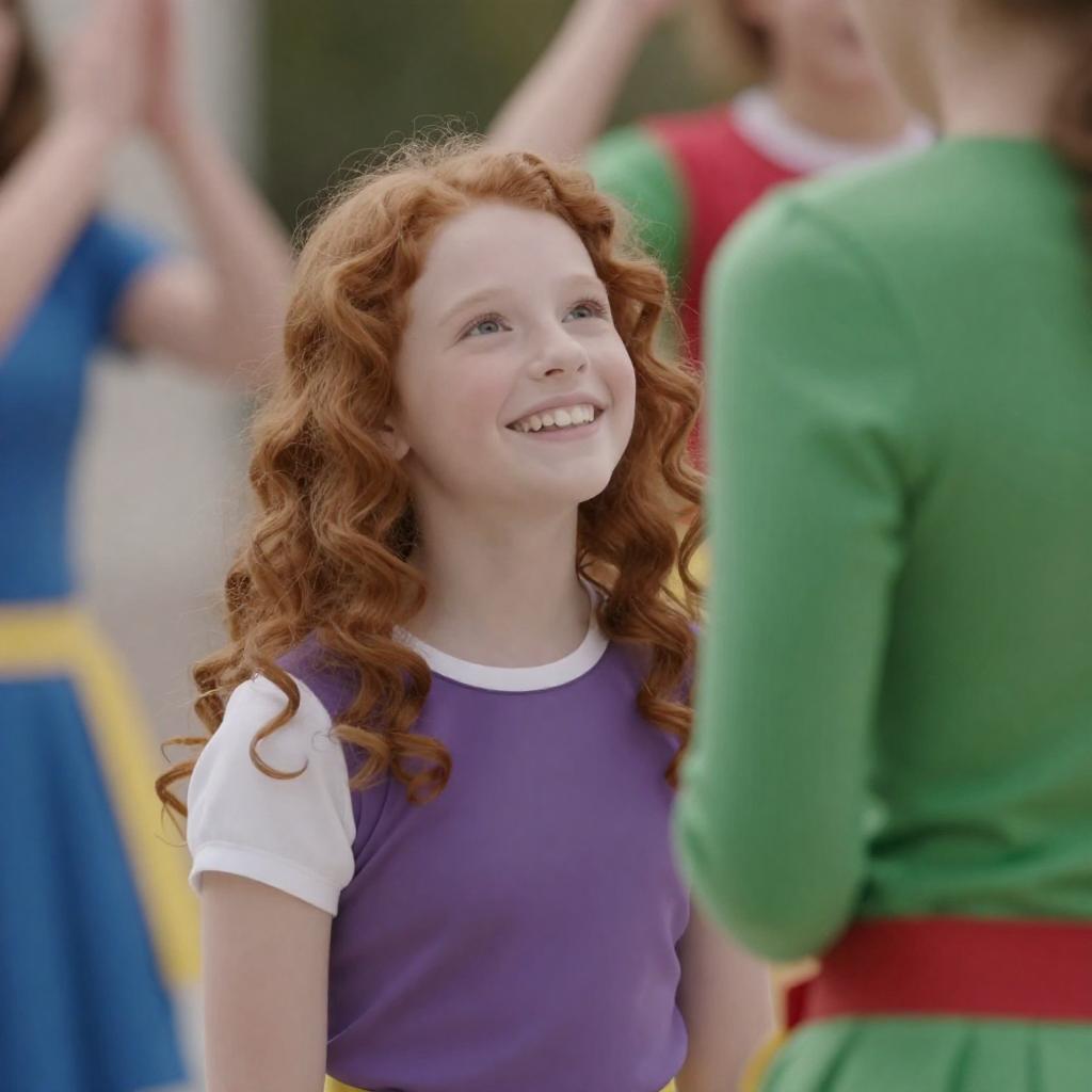 CGI image of a smiling girl with bright red, curly hair, wearing a purple shirt with white sleeves, looking up at a green, form-fitting dress with a red belt. Background includes blurred, colorful figures and arms. The girl's joyful expression contrasts with the vibrant, busy background.