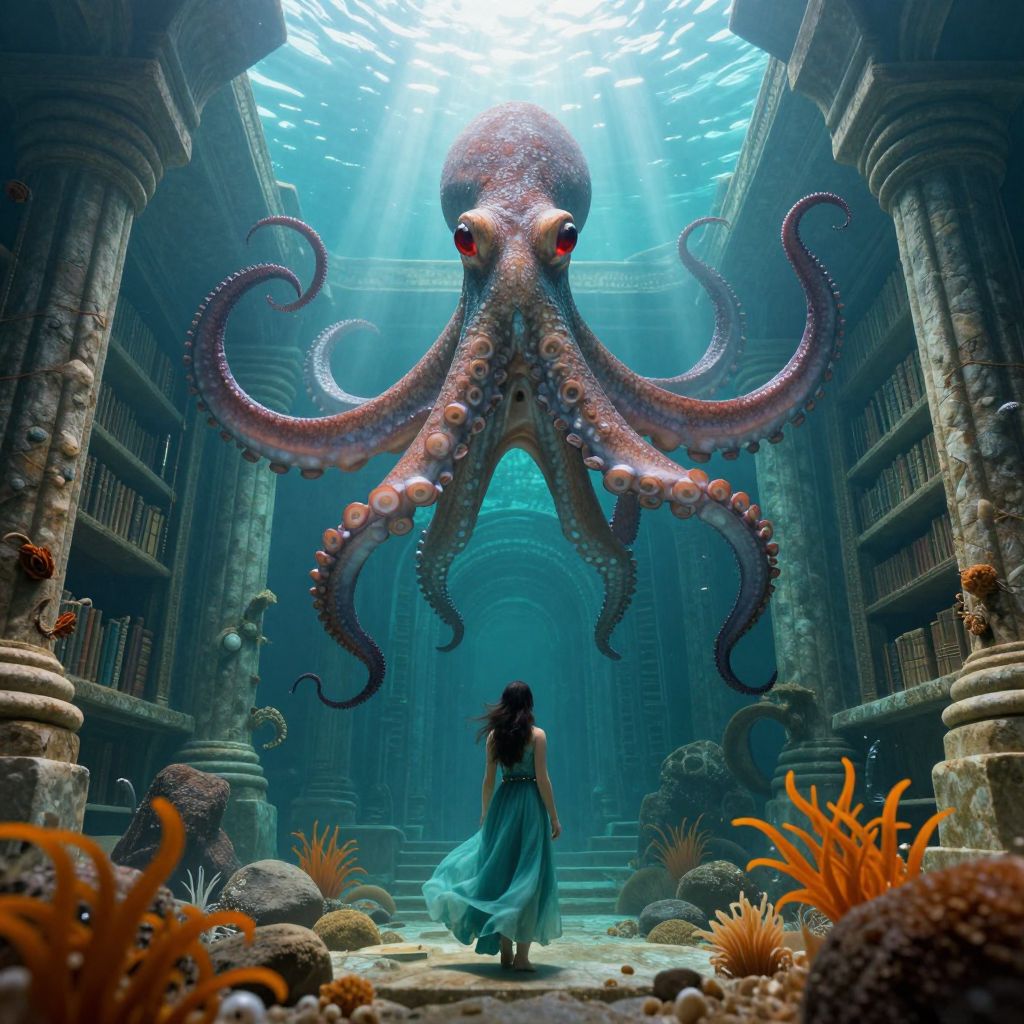 Photorealistic digital artwork depicts a colossal octopus with large, red eyes and detailed, textured tentacles standing in an ancient, underwater library. Light beams from above illuminate the scene, highlighting the octopus and a lone woman with long, dark hair, dressed in a flowing, blue dress, standing at the library's center. The background features tall, stone columns and shelves filled with books, surrounded by coral and sea anemones. The ocean floor is scattered with rocks and seaweed, creating a mystical, underwater atmosphere.