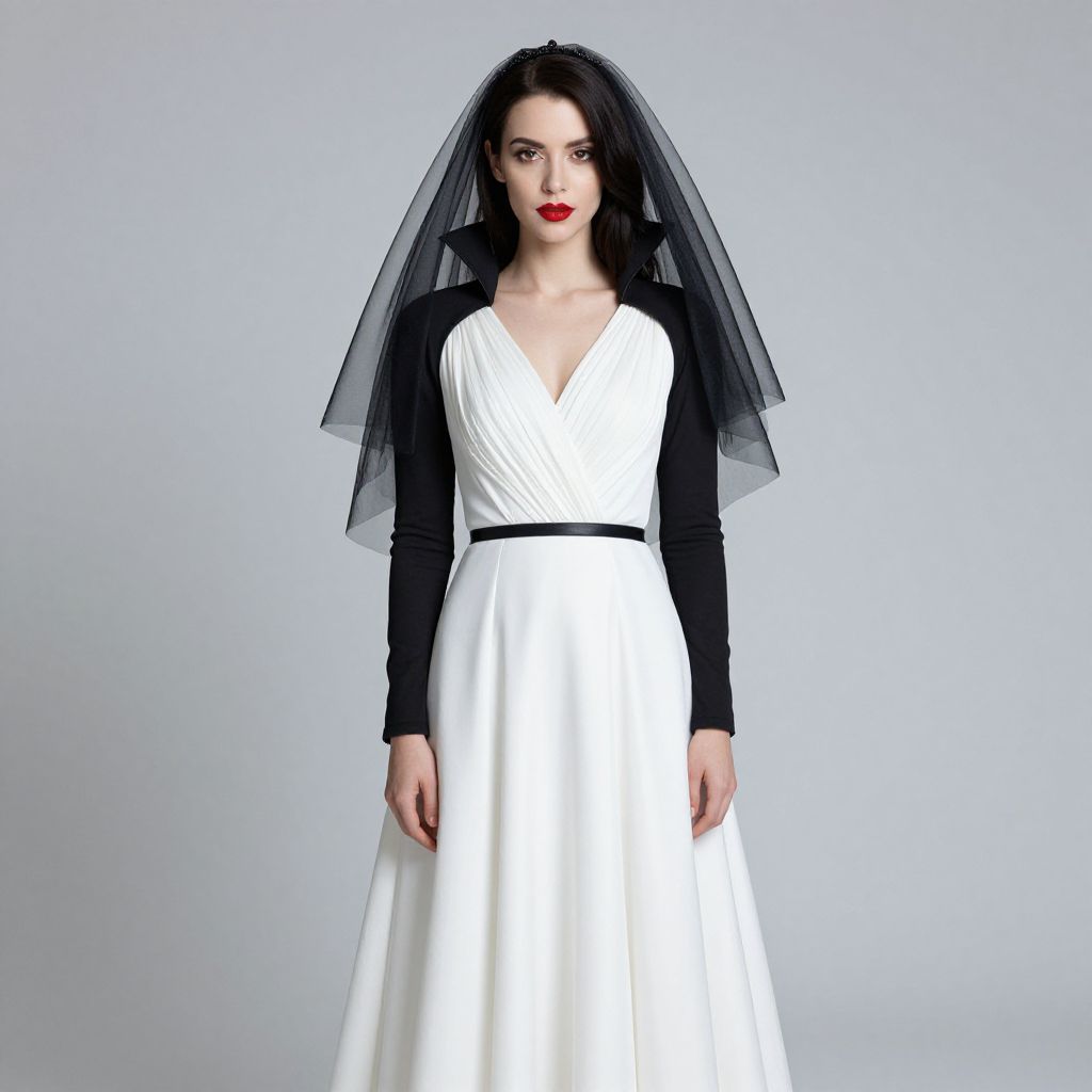 Photograph of a striking woman with fair skin, dark wavy hair, red hooded dress, and bold red lipstick, standing against a dark blue