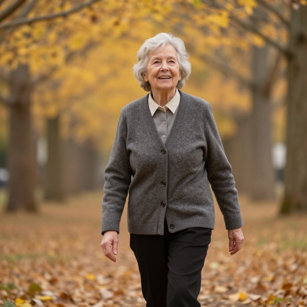 Photograph of an elderly woman with short, white curly hair, smiling warmly while walking outdoors in an autumn park. She wears a dark blue cardigan over a gray button-up shirt and navy pants. Her skin is fair with visible wrinkles, and she has a slight, cheerful expression. The background features a path lined with fallen leaves and trees with vibrant yellow and orange foliage, creating a warm, seasonal atmosphere. The image is crisp with a shallow depth of field, focusing on the woman while the background is softly blurred.