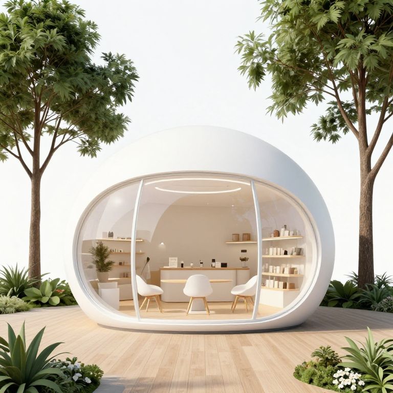 The image presents a futuristic, minimalist architectural concept sketch of a small shop with a spheroidal design. The structure features a smooth, white exterior with large, transparent glass panels that allow a clear view into the interior. Inside, the shop is furnished with three modern, white chairs arranged in a semi-circle, facing a counter with shelves displaying various items. The floor is made of ecologic wood, adding a natural touch to the otherwise sleek and modern space. Surrounding the shop are two tall, leafy trees, providing a sense of privacy and a touch of nature. The overall composition is balanced, with the shop centrally positioned and the trees flanking it, creating a harmonious and inviting atmosphere. The vegetation is neatly arranged, with small plants and flowers in the foreground, enhancing the eco-friendly and sustainable theme of the design.