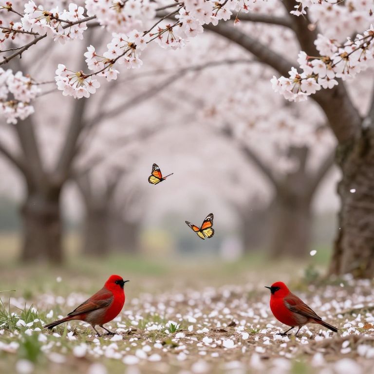 Cherry blossoms in full bloom frame a serene forest clearing, where vibrant red birds perch gracefully among scattered petals, while delicate butterflies flutter through the air, creating a harmonious spring tableau.