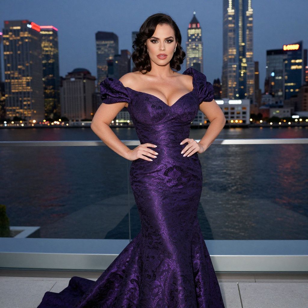 Photograph of a woman with dark wavy hair, standing confidently in front of a city skyline at dusk. She wears an off-the-shoulder, deep purple, lace gown with a fitted bodice and flaring skirt. Her hands rest on her hips, highlighting her curvy figure and ample cleavage. The background features illuminated skyscrapers, a calm river, and a glass balcony railing. The lighting emphasizes her fair skin and striking makeup, with red lipstick and dark eye makeup. The overall scene is glamorous, with a modern urban setting.