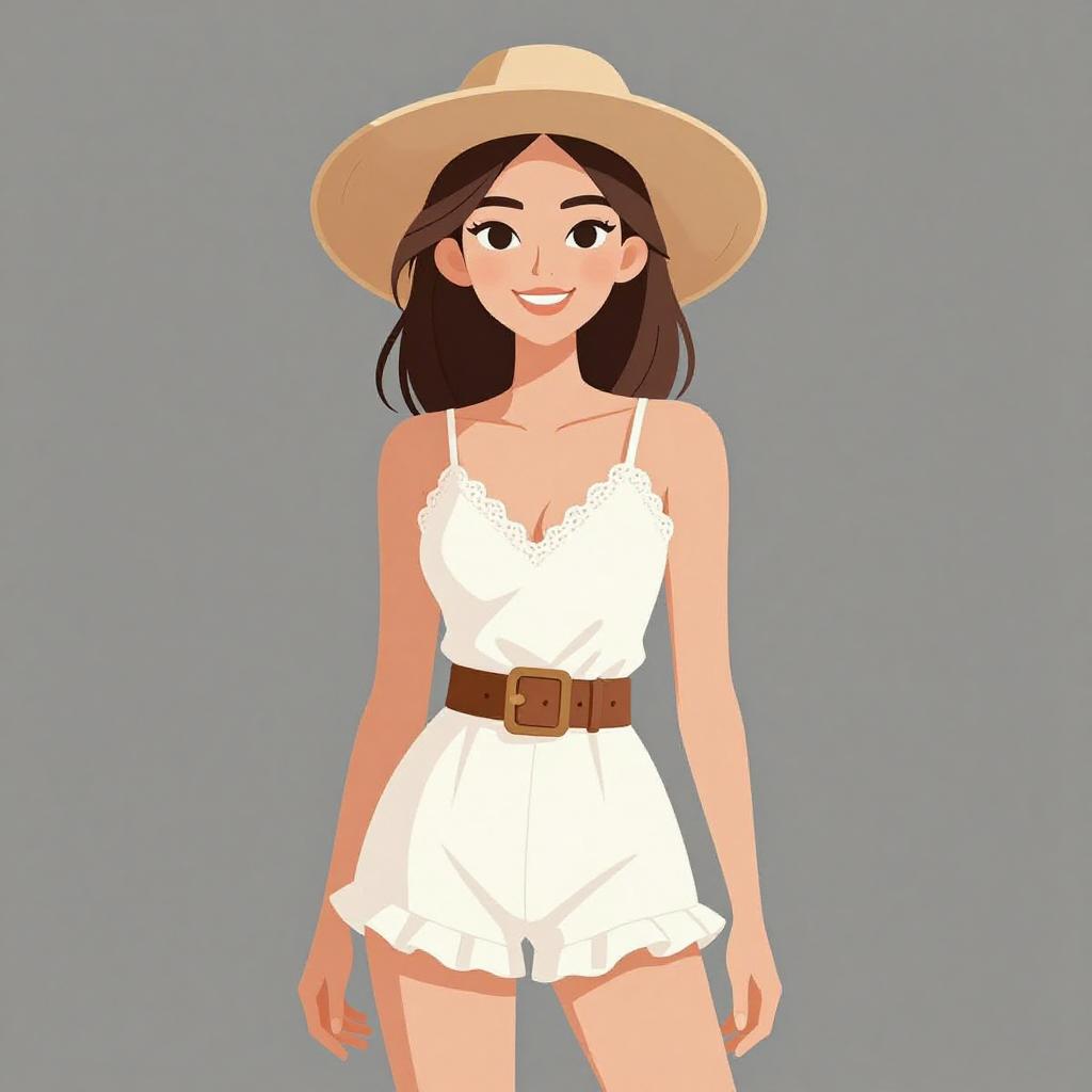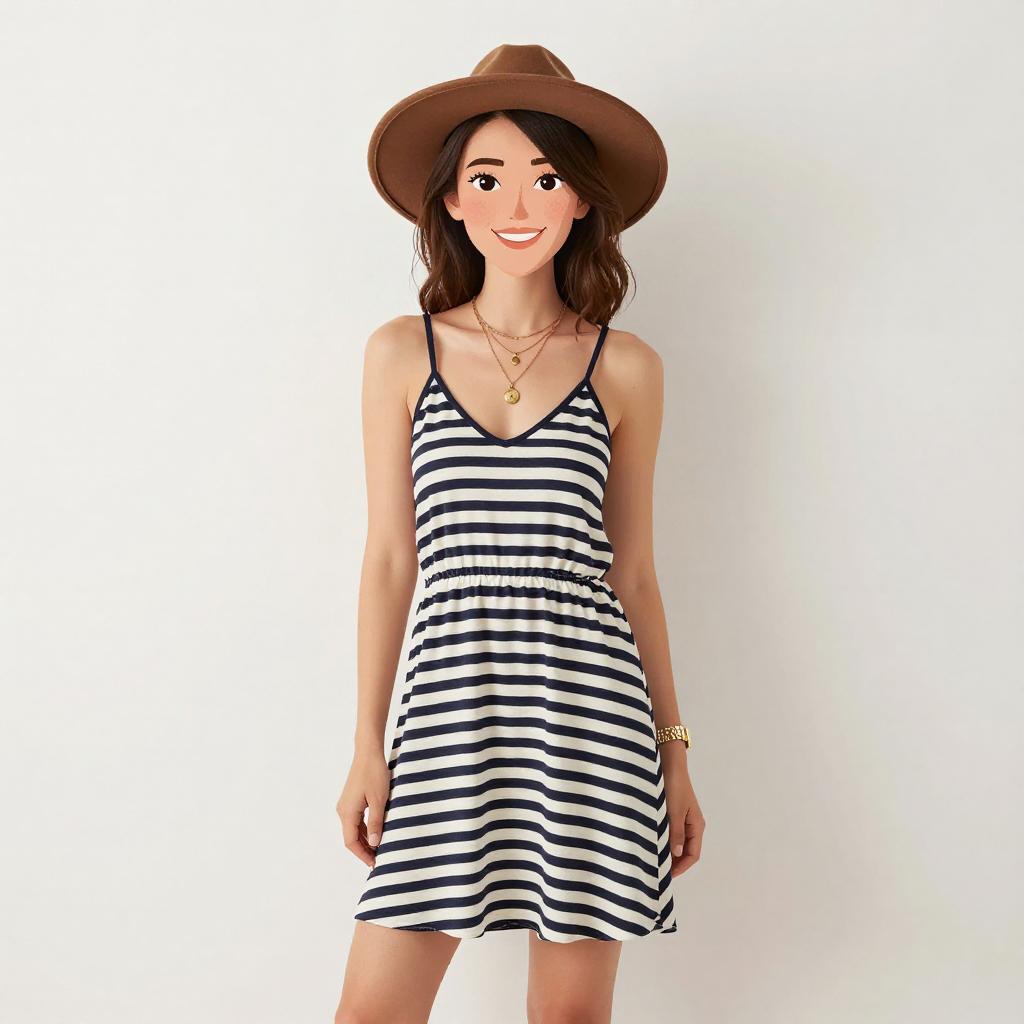 Woman with pretty face and pretty hair. smiling Woman, casual boho, relaxed-fit cami dress with horizontal black and white stripes, thin straps, V-neckline, thigh-length with a flowing hem, accessorized with a brown felt fedora, layered gold pendant necklaces, and a gold watch, against a plain white wall background. --sref 1467