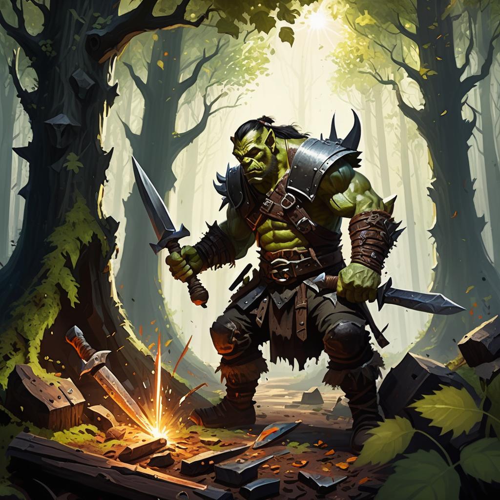 An orc blacksmith hammering a jagged dagger, in a shadowy forest clearing, with leaves rustling in the wind, dappled sunlight filtering through the trees, highly detailed and atmospheric