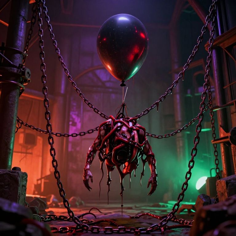 A digital CGI image depicts a grotesque, spider-like creature with glowing red eyes hanging from a black balloon by a thin string. The creature has multiple dripping, metallic, crimson claws and is suspended by chains in a dark, industrial, neon-lit room. The background features dimly lit, arched windows and scattered debris. Vibrant red, purple, and green lights illuminate the scene, creating a haunting, surreal atmosphere. The floor is cluttered with chains and metal scraps, enhancing the eerie, dystopian setting. The overall composition is dark, moody, and highly detailed.
