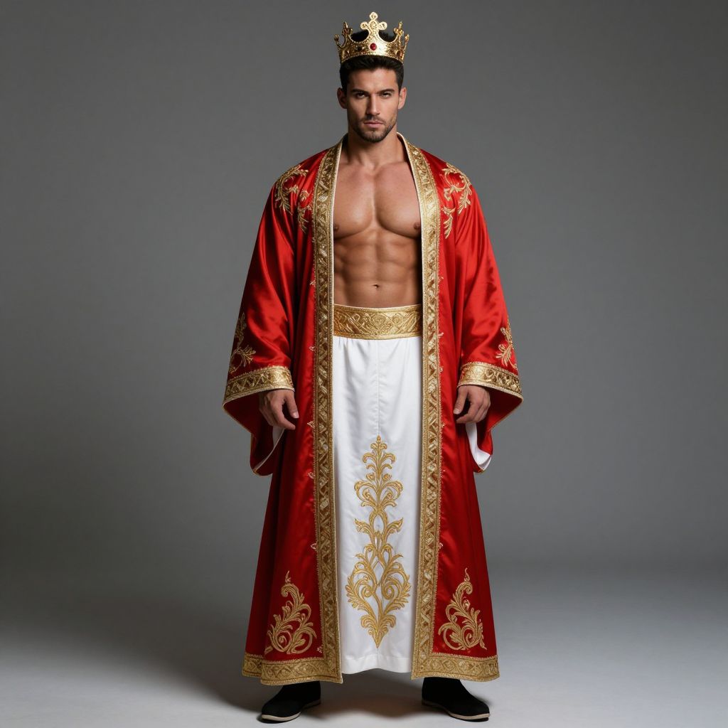 A handsome, muscular male model wearing a vibrant red and white robe, adorned with intricate gold embroidery, and a regal gold crown on his head. Full body shot, dramatic studio lighting, hyperrealistic photography.