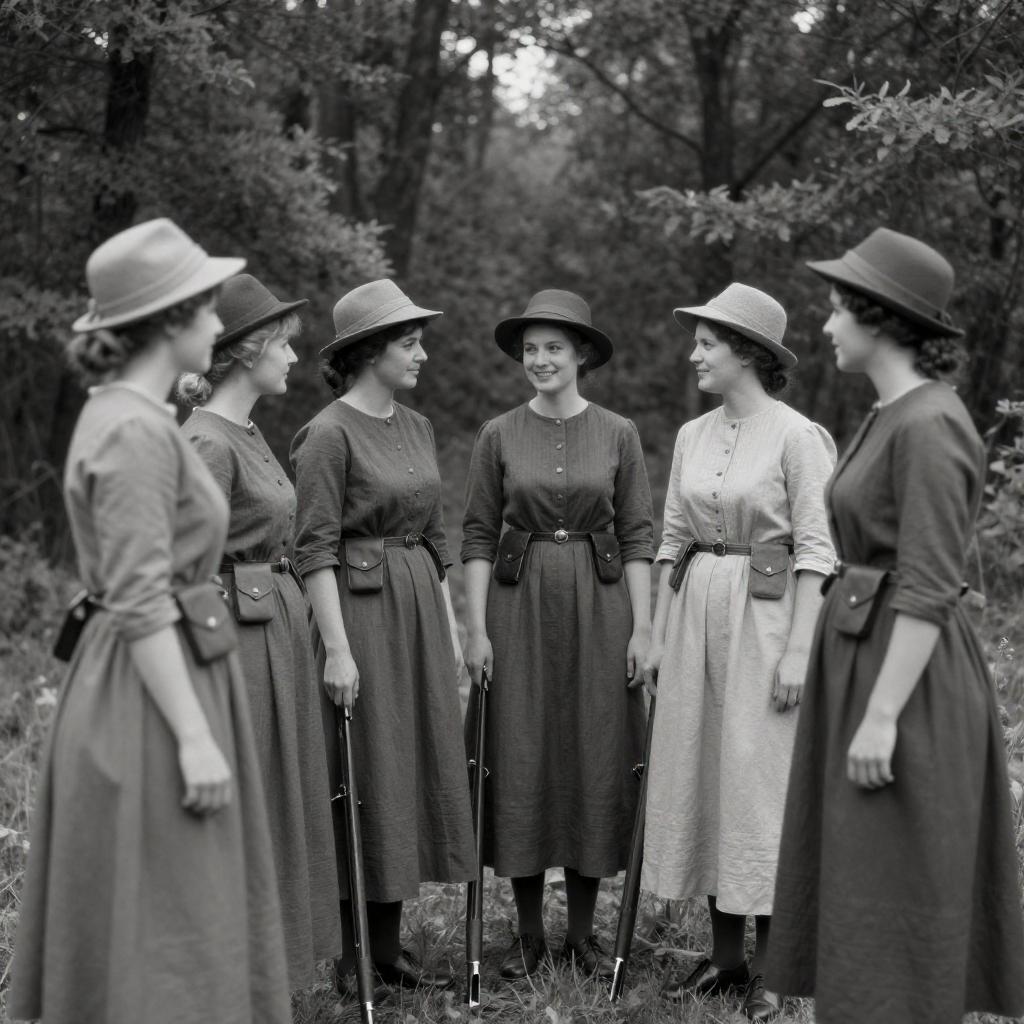 Black-and-white photograph of six women in 19th-century-style dresses and hats, standing in a forest clearing. They wear belts with pouches and carry rifles. The women are engaged in conversation, with one woman in the center smiling. The background features dense trees and foliage. The women's expressions and body language suggest camaraderie and focus.