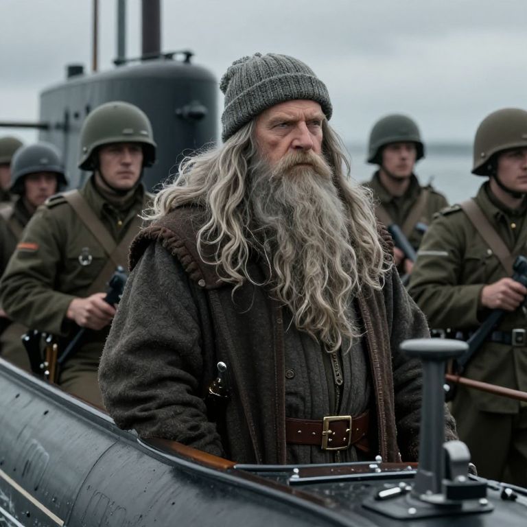 Photograph of a stern, older man with a long, flowing white beard and gray knit beanie, wearing a dark brown, woolen coat with a leather belt. He stands in the foreground of a military-style boat, surrounded by six soldiers in olive green uniforms and helmets. The soldiers, with serious expressions, hold rifles. In the background, a large black submarine is partially visible. The sky is overcast, adding a somber tone to the image. The man's intense gaze and weathered appearance contrast with the disciplined, uniform soldiers.
