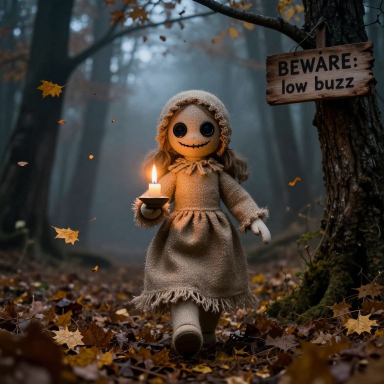 A small Austrian Burlap Doll girl with large black button eyes and head crafted from jute material and a sinister grin emerges, her gaze illuminated only by the soft, flickering glow of a candle held delicately in her hand, As she the interiorof an eerie old abandoned house, leaves carpeting the ground with a crunchy rustle, duse and cobweb cover the surfaces, The atmosphere is both whimsical and unsettling, as if the very house itself holds secrets and whispers tales to this enigmatic doll, In a picture frame on the wall are the words: \"low buzz\