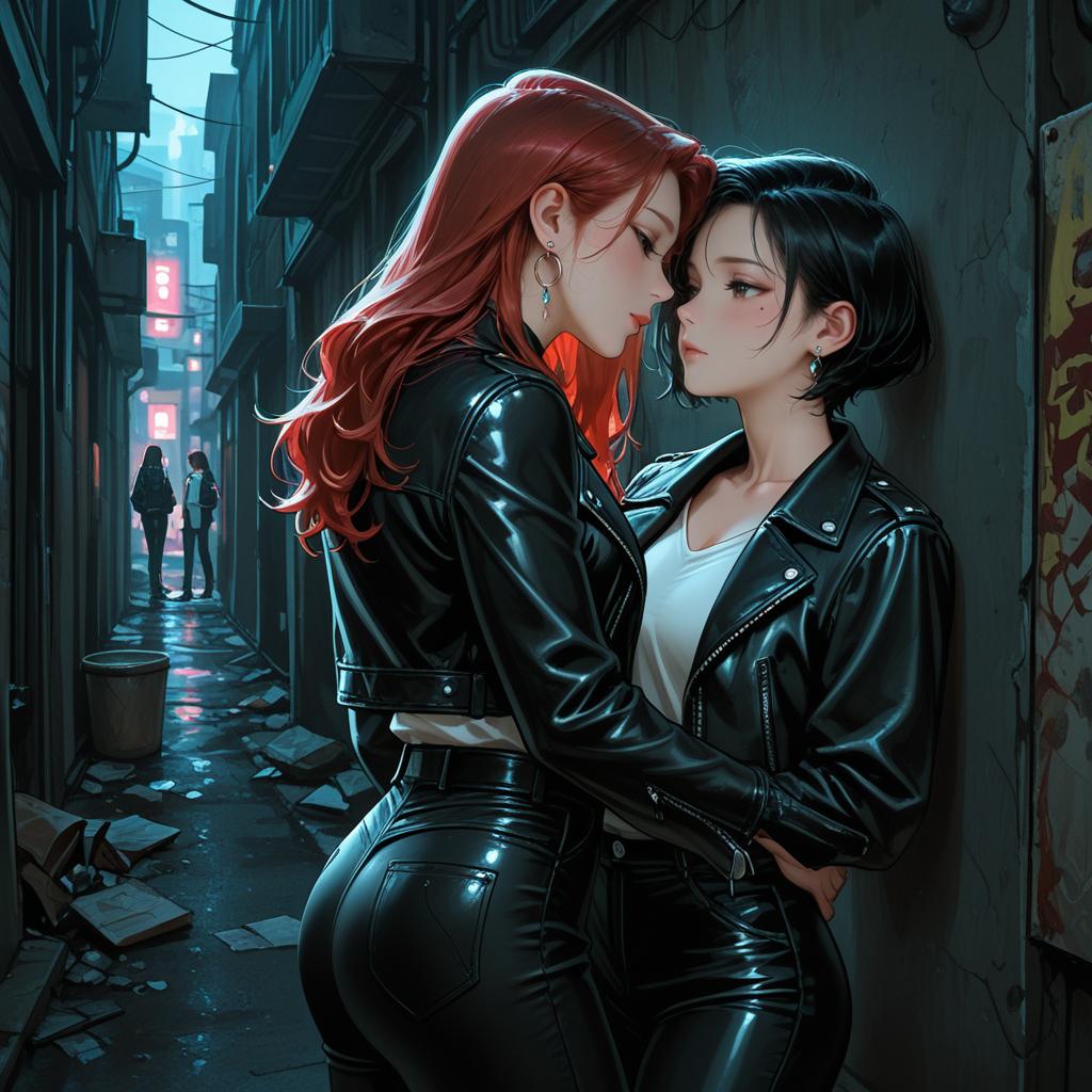 Digital artwork of two fashionable women standing indoors, both wearing black leather jackets and black crop tops. The woman on the left has pink asymmetrical hair with an undercut and visible rose tattoos on her chest, while the woman on the right has blonde hair with yellow tips. Both wear statement earrings and necklaces, showcasing makeup with eyeshadow and lipstick, emphasizing their midriff and cleavage.