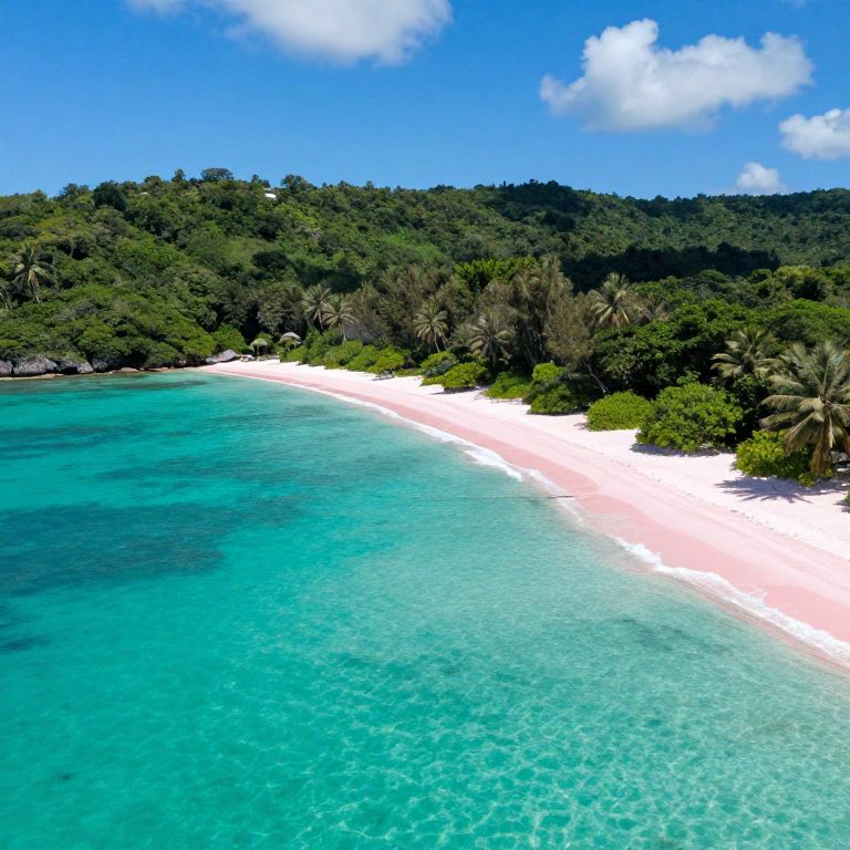 Photograph of a tropical beach with turquoise water, white sand, and a large, dark cave entrance in a rocky cliff. Lush greenery and
