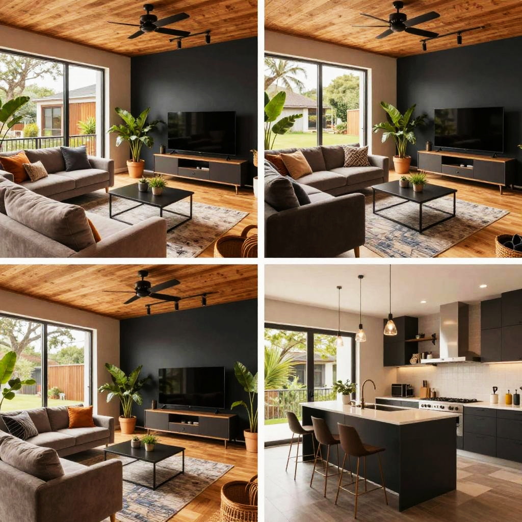This image is a composite of four photographs showcasing a modern, stylish living room with a mix of dark and light tones. It features large windows letting in natural light, plush furniture with colorful cushions, potted plants, and a wooden ceiling. The space includes a TV area, a cozy seating section, and a sleek kitchen island. The overall vibe is contemporary and inviting.