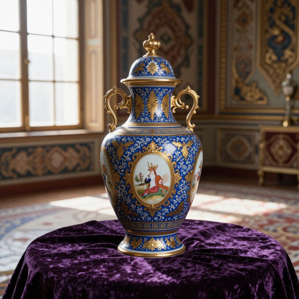 Urna crafted from elegant blue porcelain decorated with intricate gold patterns, sitting on a velvet cloth in a richly decorated oriental room, sunlight from a large window illuminating delicate details, high-resolution still life with a classic artistic touch.