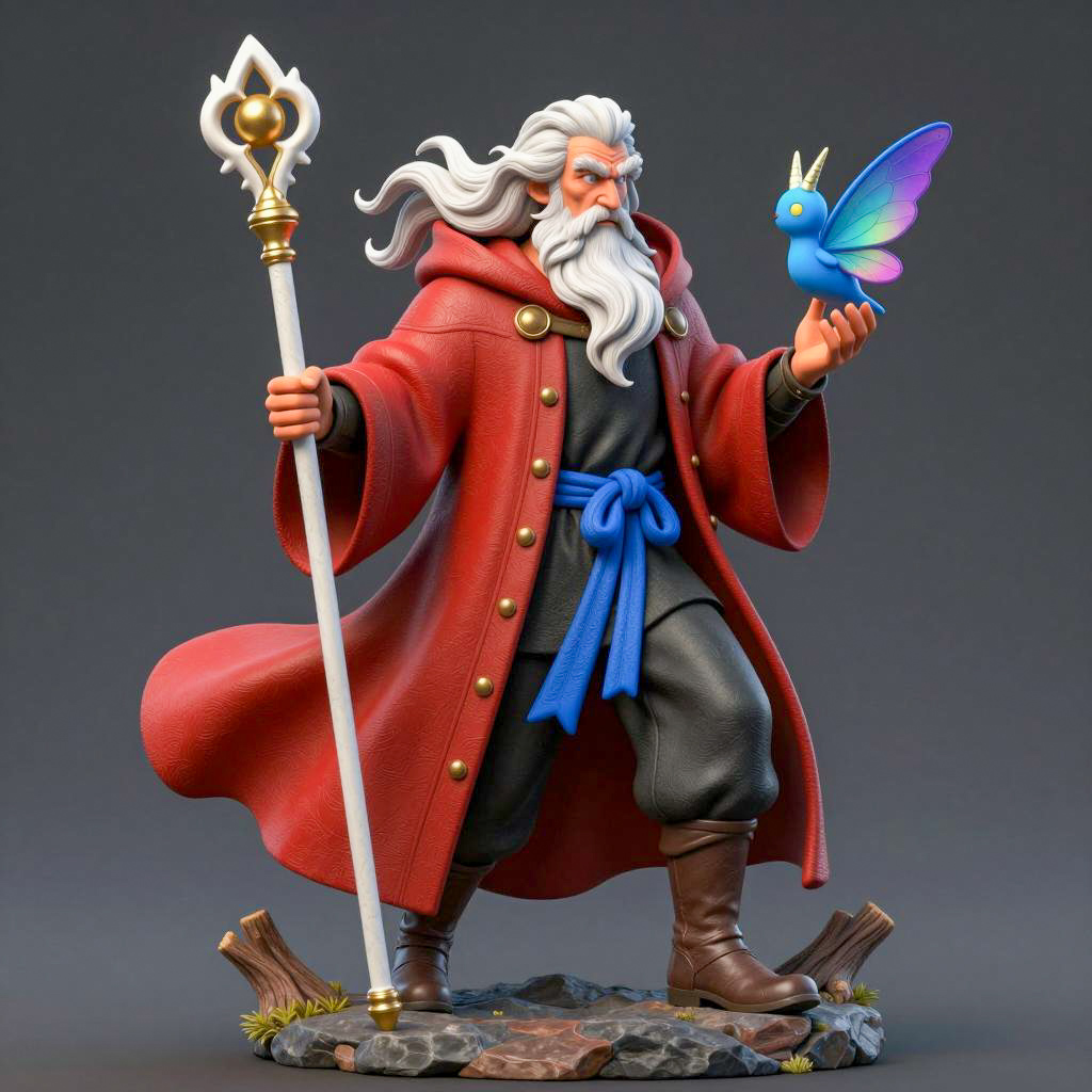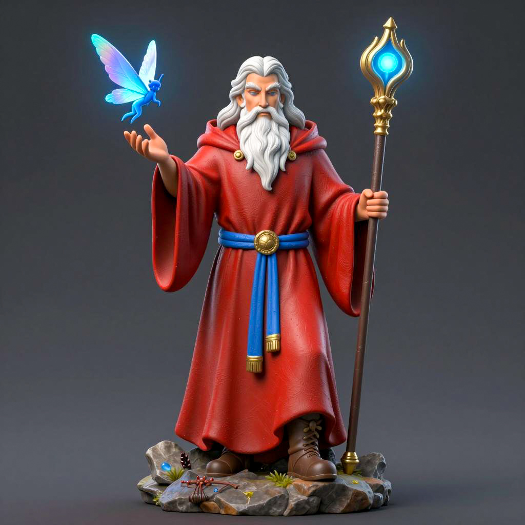 Wizard statue with white beard, long white hair, red robe, blue sash, brown boots, holding a glowing staff, and a blue, rainbow-winged fairy in his right hand. Wizard stands on a rocky base, looking downward. Illustration style.