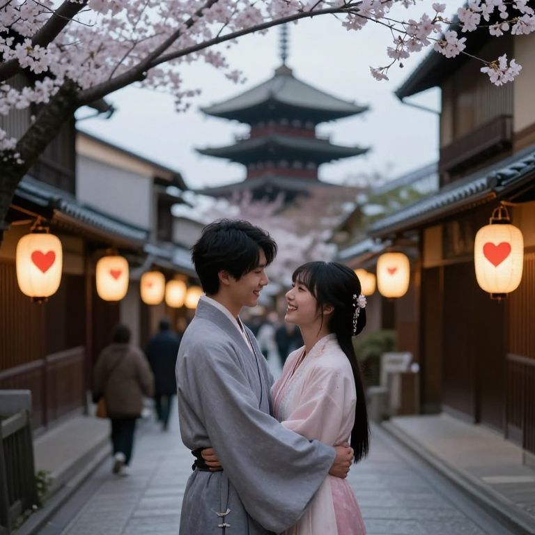 Romantic couple embracing warmly under glowing red lanterns in a traditional Kyoto street, capturing the essence of a timeless wedding moment.