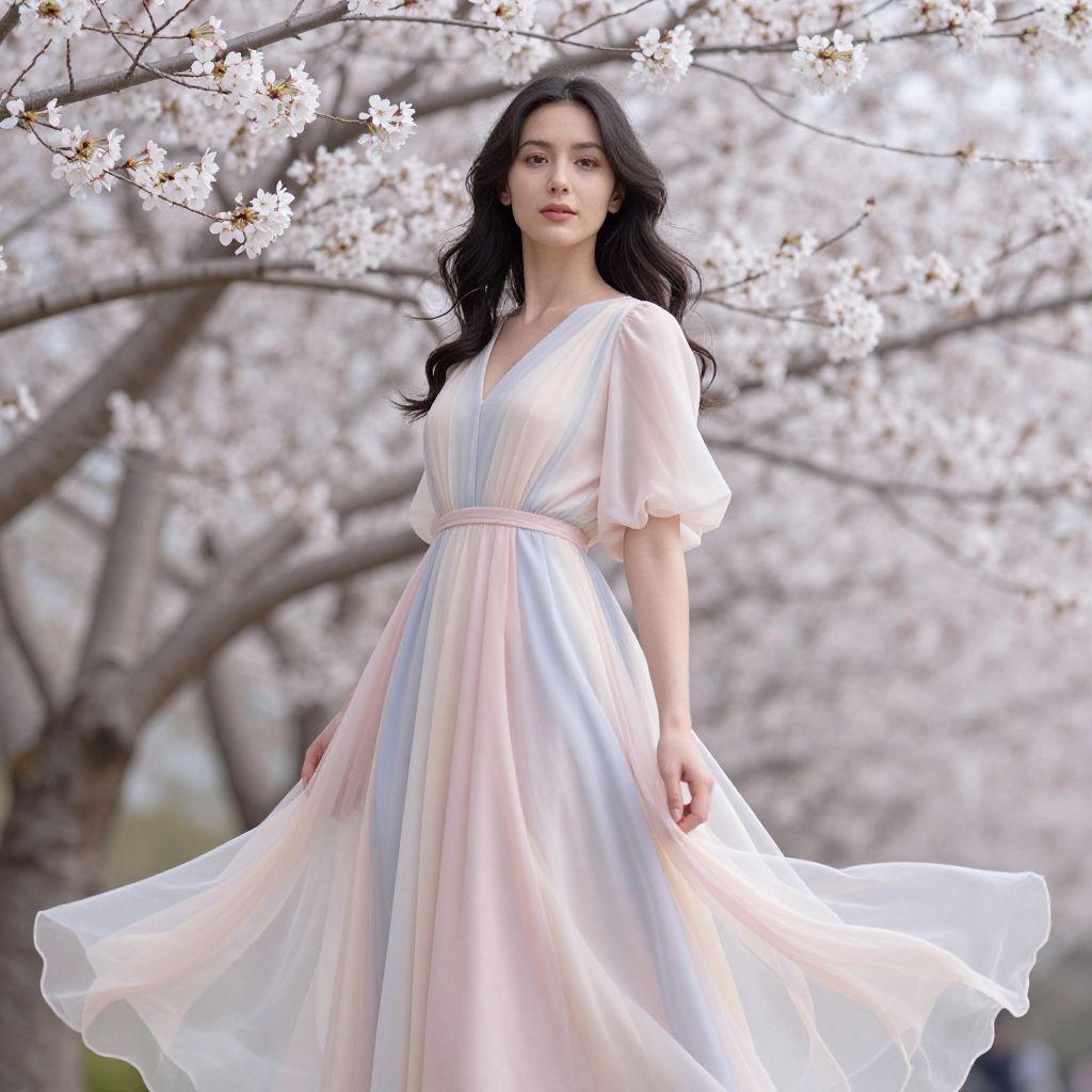 Photograph of an Asian woman with long black hair, wearing a flowing, pastel-colored, V-neck dress, standing amidst blooming cherry blossoms