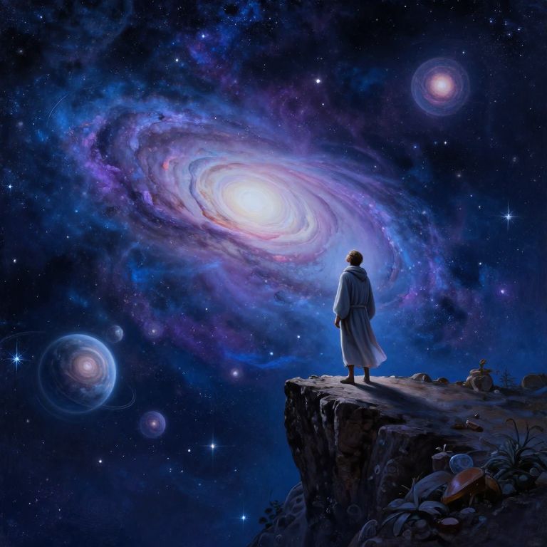Digital artwork depicting a lone figure, dressed in a long, flowing white robe and standing on a rocky cliff at night. The figure gazes upward at a vibrant, swirling galaxy in the star-filled sky. The galaxy, with hues of blue, purple, and pink, dominates the upper center of the image. Surrounding the galaxy are smaller, glowing celestial bodies. The rocky cliff is dark with scattered rocks and grasses at its base. The overall scene is illuminated by the galaxy's luminosity, creating a mystical and awe-inspiring atmosphere.