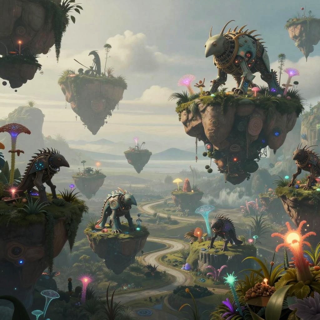 Digital art generator producing surreal landscapes filled with floating islands, bioluminescent plants, and intricate mechanical creatures, blending organic forms with advanced technology in a dreamlike, otherworldly setting illuminated by soft, ethereal light