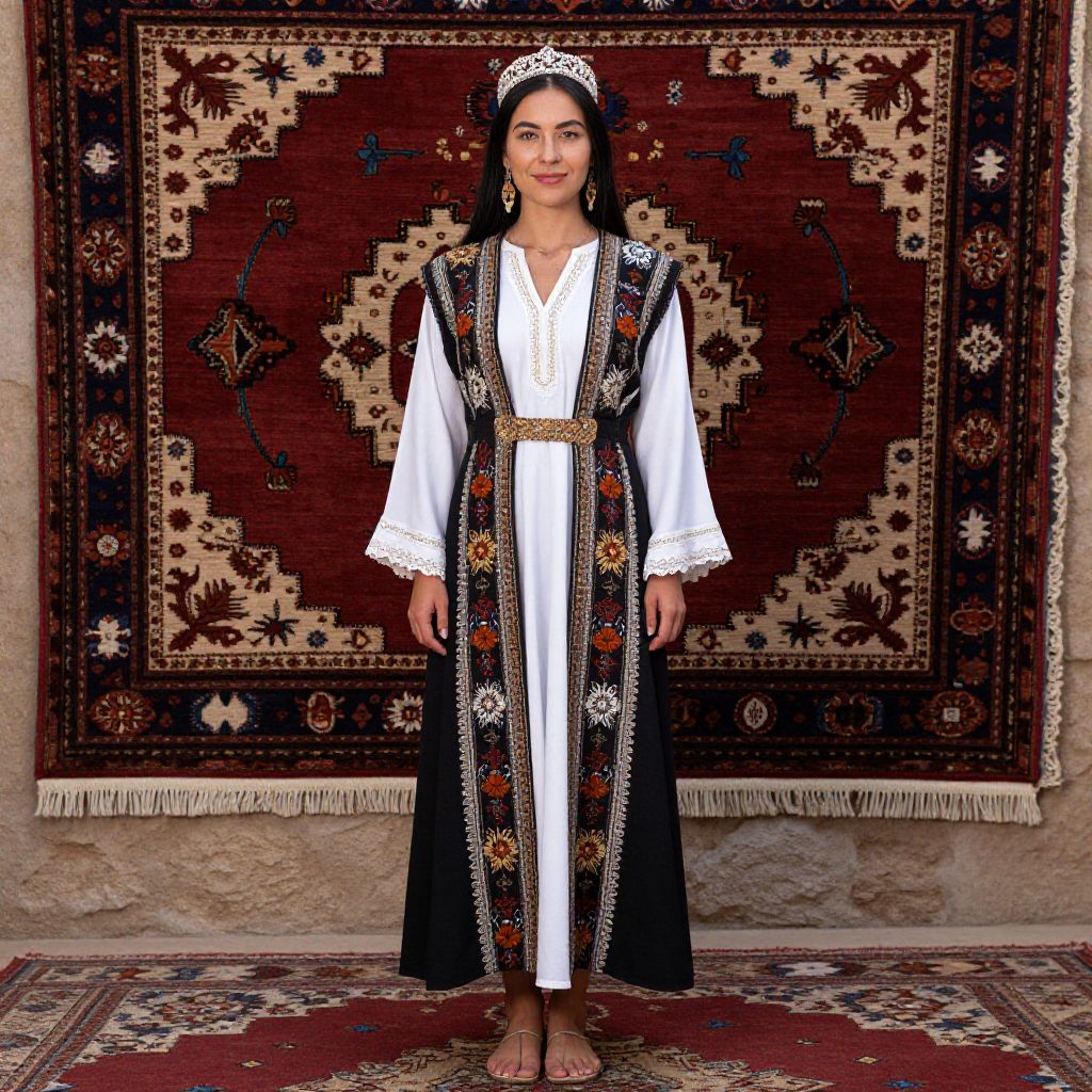 "Traditional Tribal Dress, woman in traditional dress standing in front of a rug"