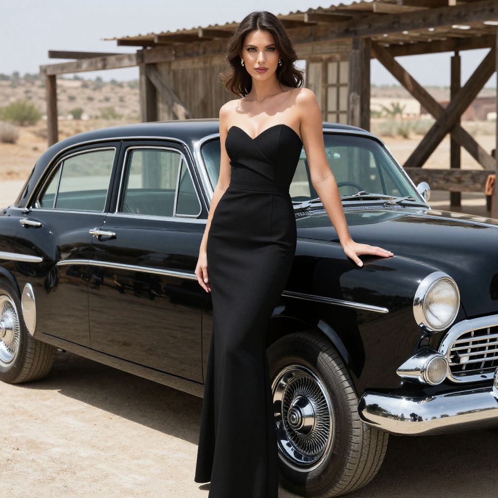 Photograph of a slender woman with fair skin and dark brown, wavy hair standing beside a shiny black vintage car. She wears a strapless, form-fitting black evening gown and red lipstick, exuding elegance. The car, with chrome details and classic design, is parked on a dusty, sunlit road in front of a rustic wooden structure. The background shows a dry, arid landscape under a clear blue sky. The woman leans against the car with a confident, poised stance, her left hand resting on the car's door. The overall scene evokes a sense of timeless, classic glamour.