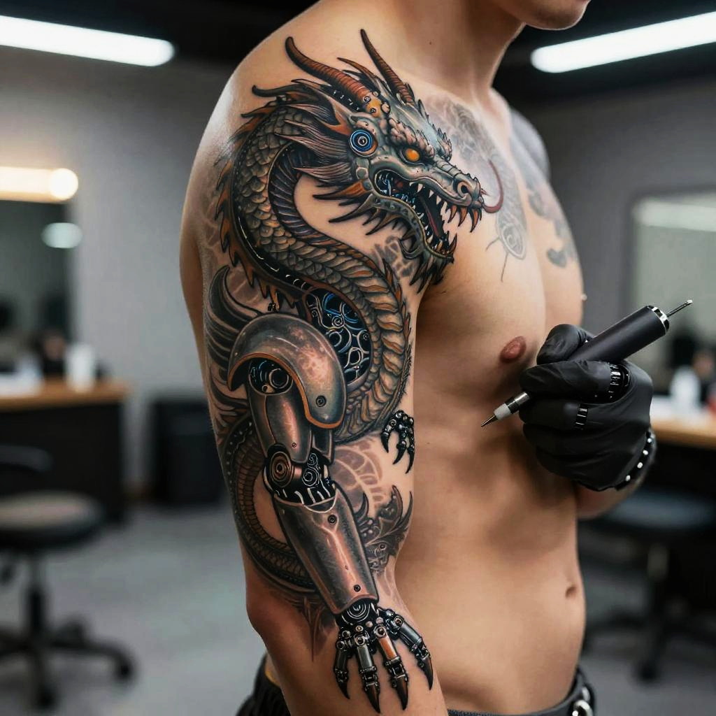 Tattoo AI generator free concept art featuring a sleek robotic arm artistically inking a surreal, biomechanical dragon tattoo on human skin, detailed textures and metallic highlights, with soft ambient lighting in a modern tattoo studio environment.