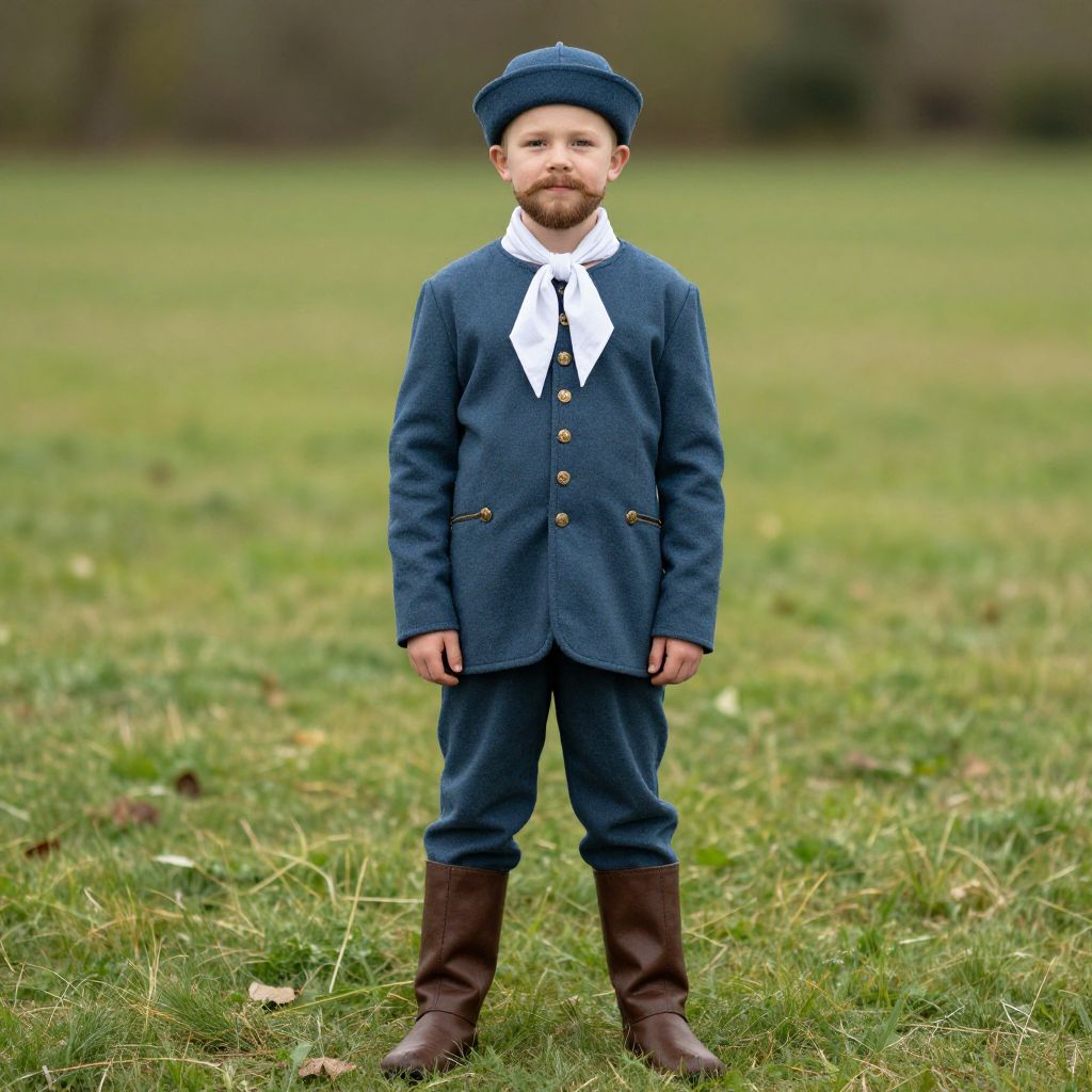 Photograph of a young boy with a beard, wearing a Victorian-style blue jacket, white cravat, navy hat, brown boots, standing on