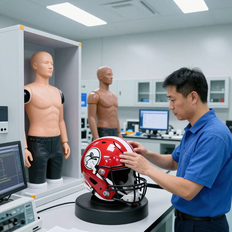 Dynamic scene of a football helmet builder testing helmet durability in a lab, showing crash test dummies and impact simulation, high-tech lab environment with bright clinical lights, mix of realism and technical illustration style with detailed equipment