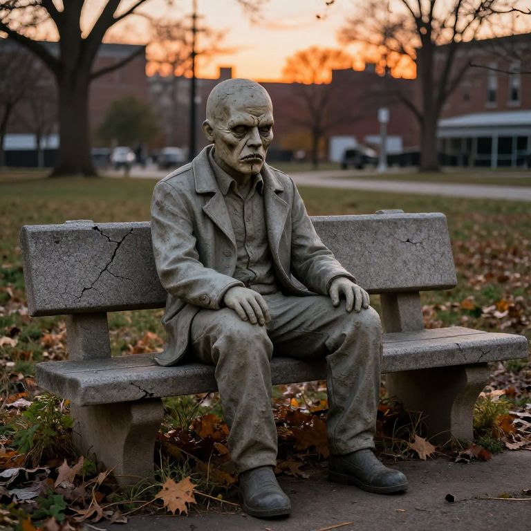 A photograph of a weathered, gray stone statue of an elderly man with a stern expression, seated on a cracked concrete bench in a park. He wears a suit and tie, with his hands resting on his lap. The background features an orange sunset, bare trees, and scattered autumn leaves on the ground. In the distance, a red-brick building and a glass-roofed structure are visible. The statue's texture is rough, mimicking aged stone, and the bench has visible cracks. The scene conveys a somber, reflective mood.