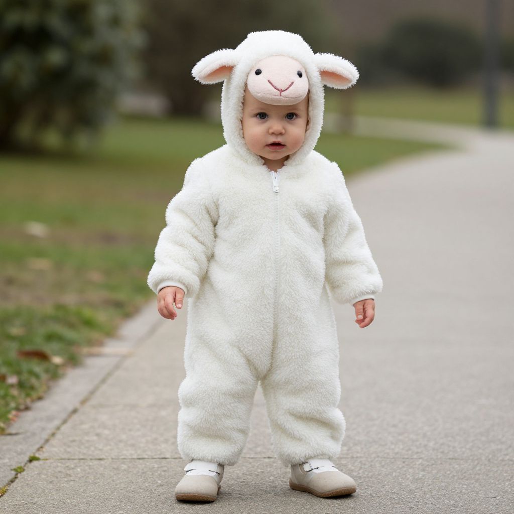 Toddler Costume, baby in a sheep costume standing on a sidewalk