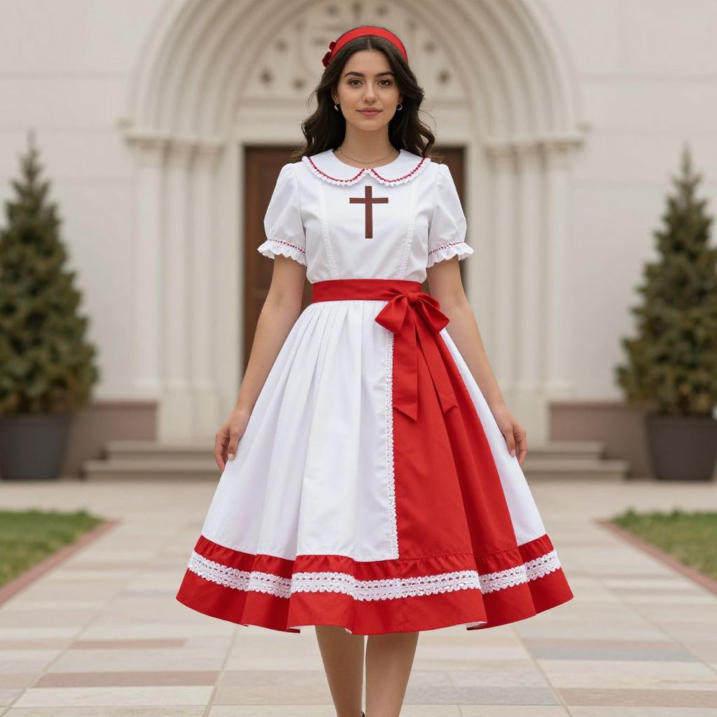 "Easter Church Attire, woman in a white and red dress with a cross"