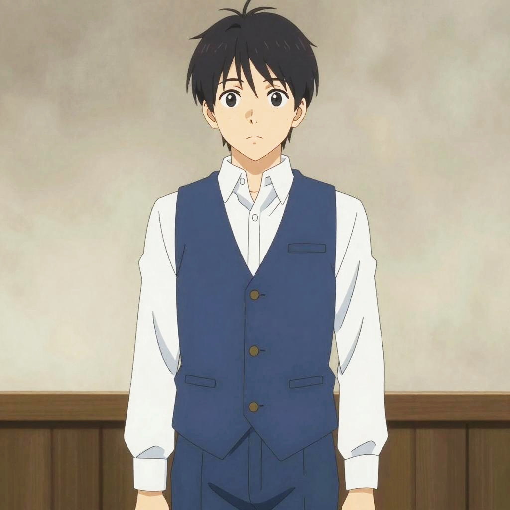 Anime Costume For Boy, image of a young man with a white shirt and blue vest