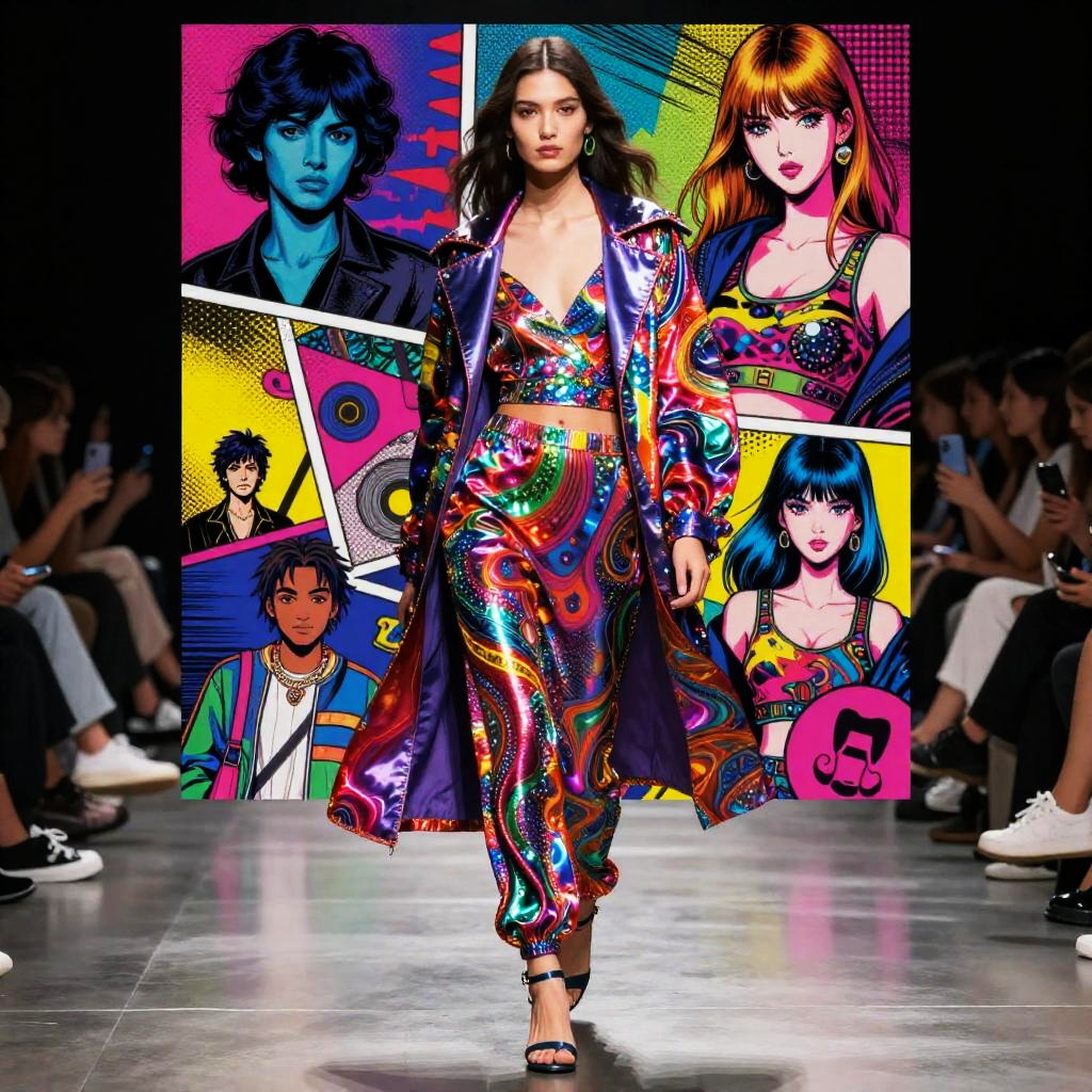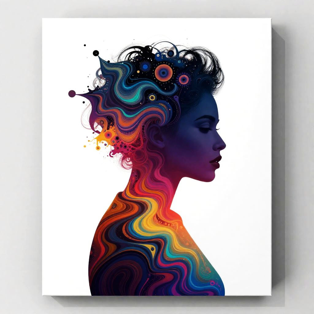 A vibrant explosion of pastel colors and watercolor illustration inspired by the works of renowned artists. Richly detailed patterns flow together, showcasing an abstract figure. Infused with elements of pop culture, the artwork takes form on a grand canvas, styled to reflect the essence of high-end fashion photography.