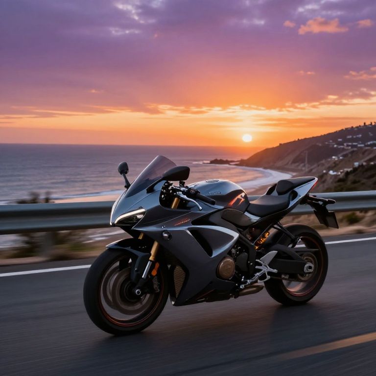 125s motorcycle speeding down a scenic coastal highway at sunset, dynamic motion blur, vibrant colors contrasting with the orange and purple sky, detailed reflections on the sleek bike surface, adventurous and exhilarating atmosphere.