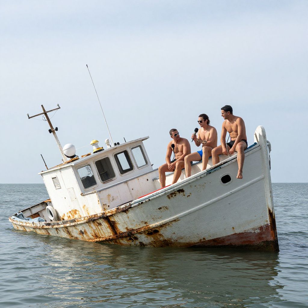 Wide Angle boat wreck, only a small part of the boat is above water, and most of the boat is sunken. 3 men in swimsuits sit on the top of the boat, recording a podcast with a gigantic microphone,