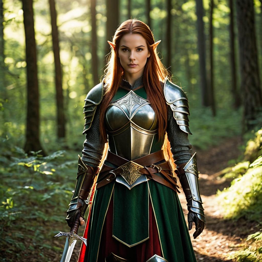 Photorealistic image of a serious elven woman warrior standing in a forest by a rocky stream. She has long brown hair, pointed elf ears, and wears detailed green and brown medieval fantasy armor with intricate metal designs and leather straps. Sunlight filters through the trees, highlighting the realistic textures of her armor and clothing. The natural background emphasizes the fantasy and medieval aesthetic.
