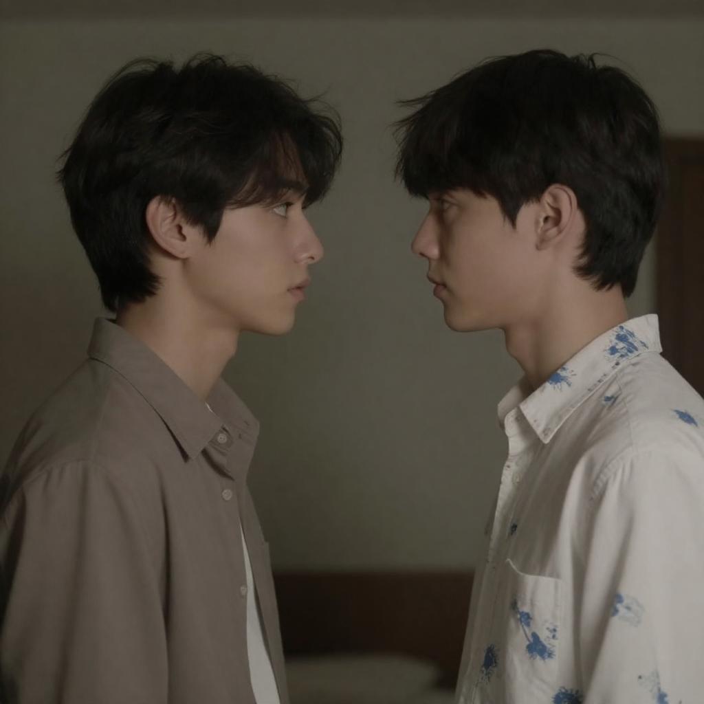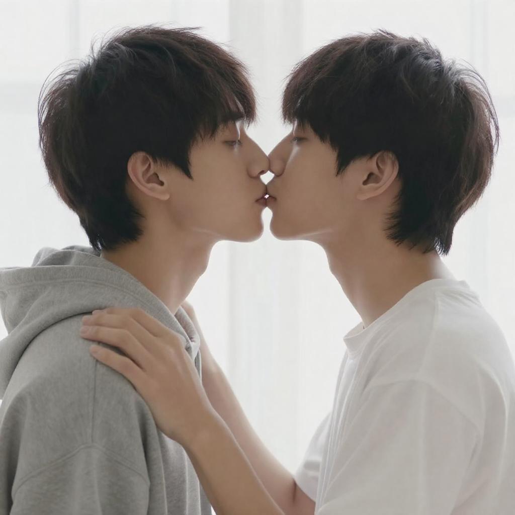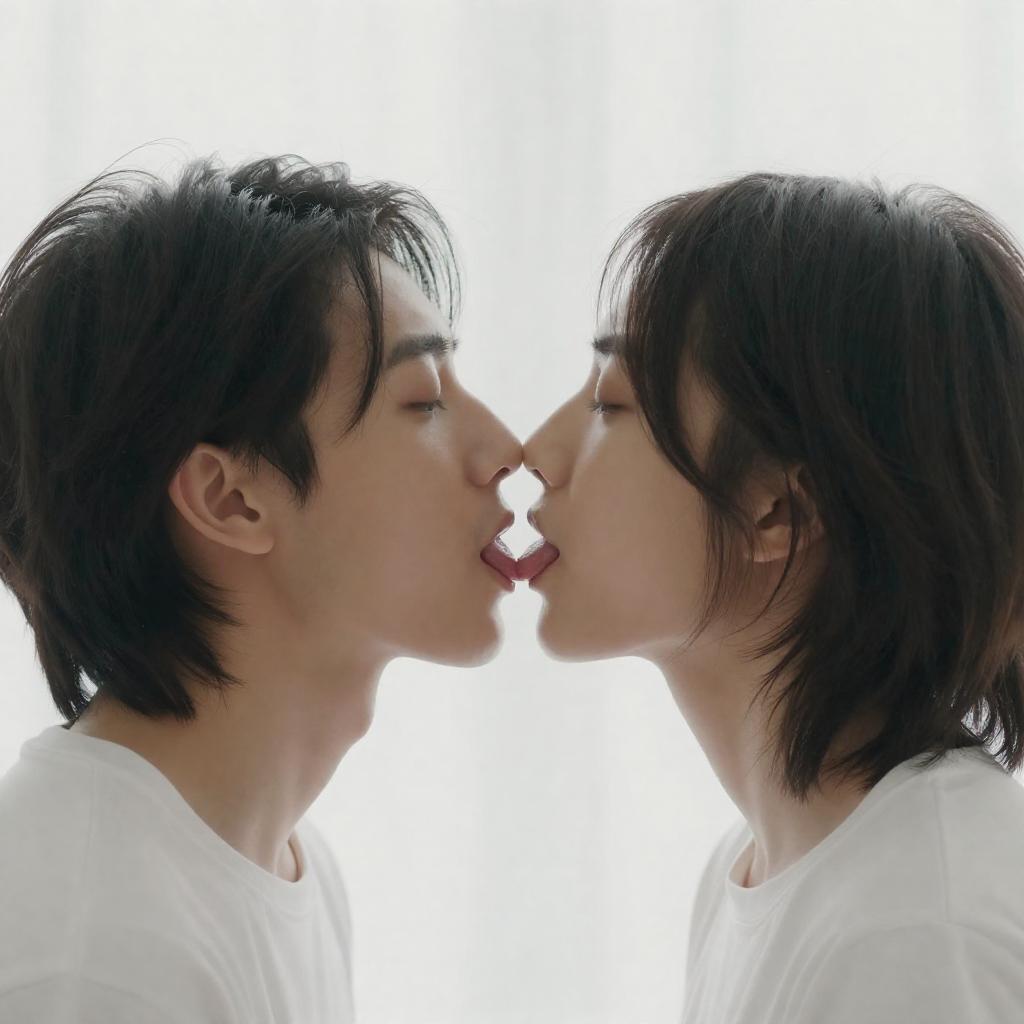 Photograph of two young men with short, dark hair, facing each other closely. The man on the left wears a gray hoodie, while the man on the right wears a white shirt. They are about to kiss, with the man on the right gently holding the other's shoulder. Bright, blurred background.
