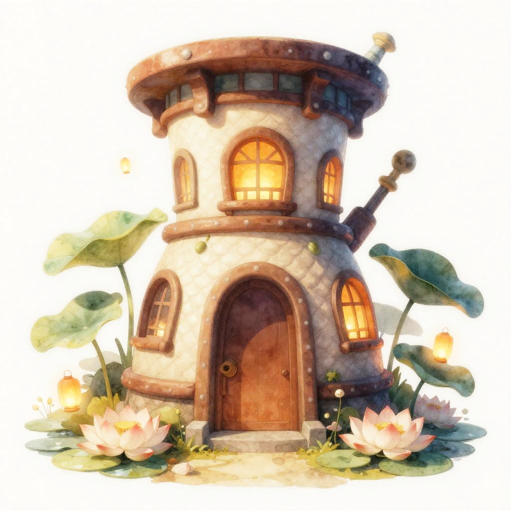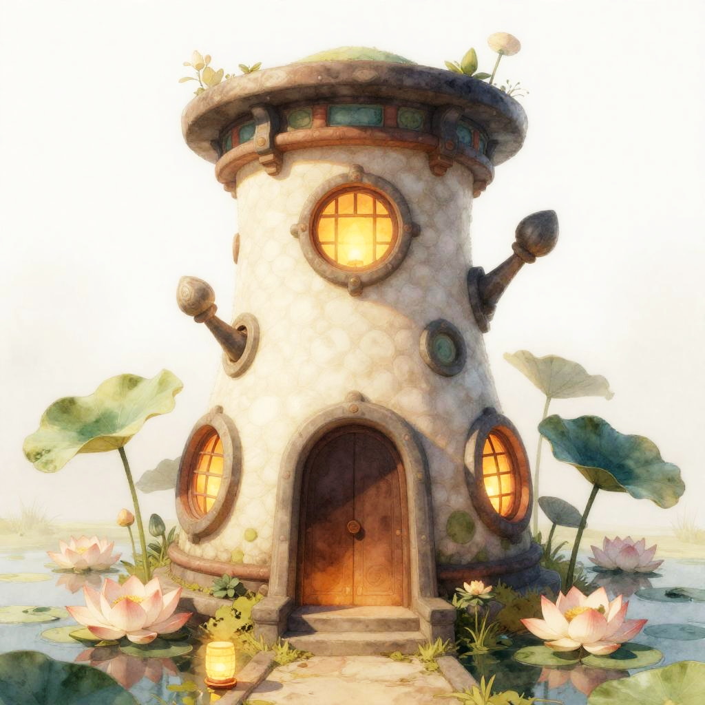 A fantasy architectural illustration featuring a whimsical hourglass-shaped tower with intricate scale-like textures, a large curved doorway, and round windows emitting cozy warm light, surrounded by sunken lotus pond with floating lanterns and oversized lily pads, rendered in a highly detailed soft-focused watercolor style, evoking a magical and inviting atmosphere.