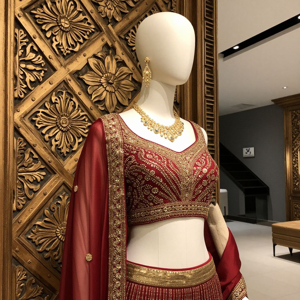 Photograph of a white mannequin wearing a traditional Indian bridal outfit. The outfit includes a red and gold embroidered blouse with a deep neckline, and a matching red dupatta with gold borders. The mannequin also wears a large, intricate gold necklace and dangling gold earrings. The background features an ornate, wooden lattice panel with floral carvings. The room has a modern, minimalist design with dark gray walls and recessed lighting. A brown upholstered bench is partially visible in the background. The image emphasizes the rich textures and elaborate embroidery of the traditional attire.