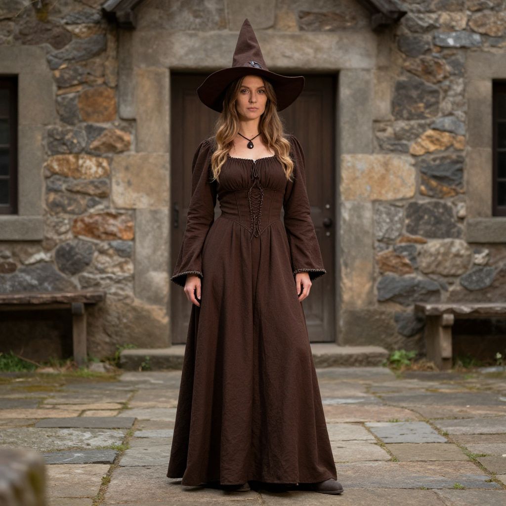 Peasant Witch Costume, woman in a brown dress and hat standing in front of a stone building