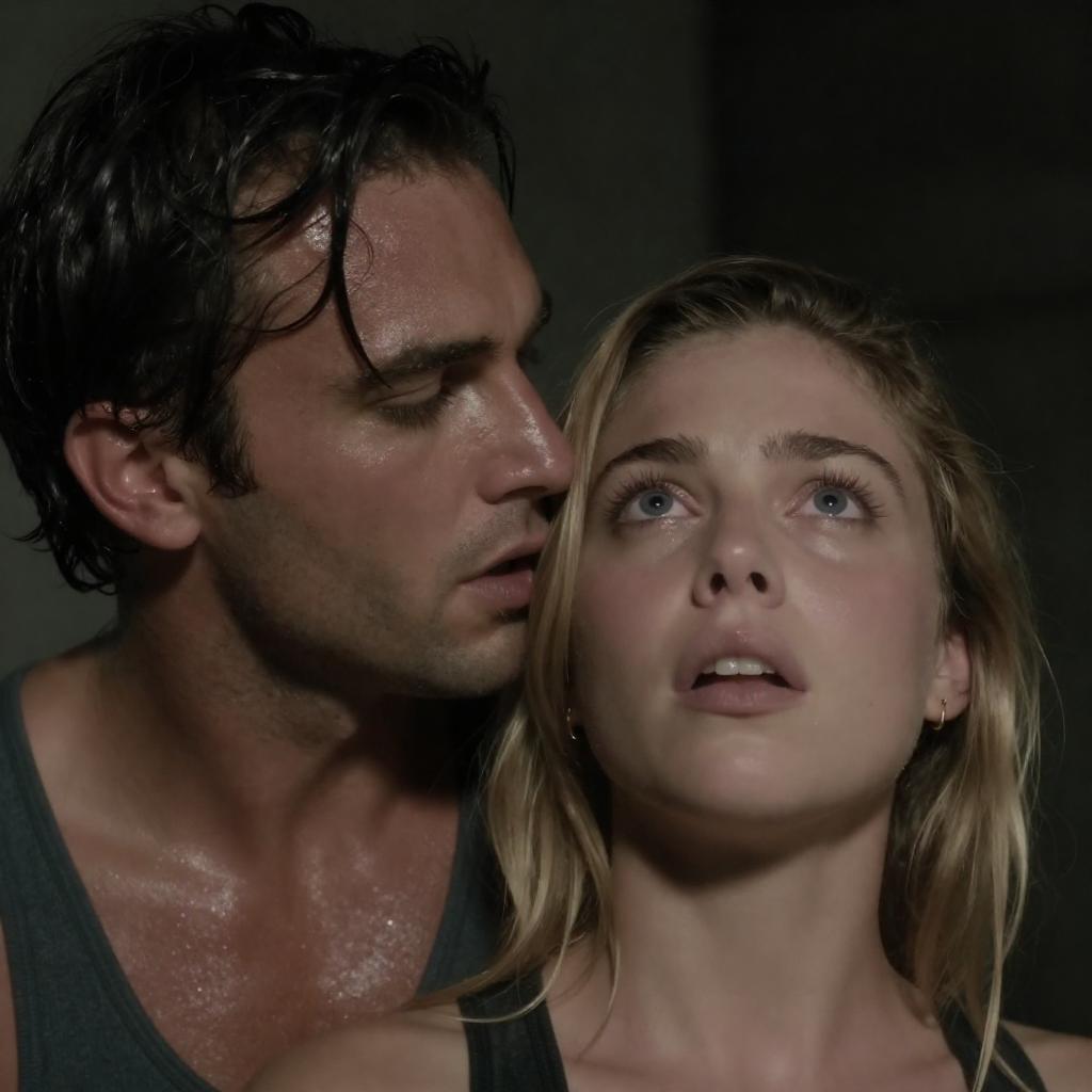 Photograph of a forest scene with a shirtless man and a blonde woman in a red bodysuit. The man kneels behind her, gripping her waist. She sits on a blue cloth with red fabric beside them. She wears black boots. Tall trees with green leaves fill the background. The man's facial expression is intense, and the woman's expression is open-mouthed.