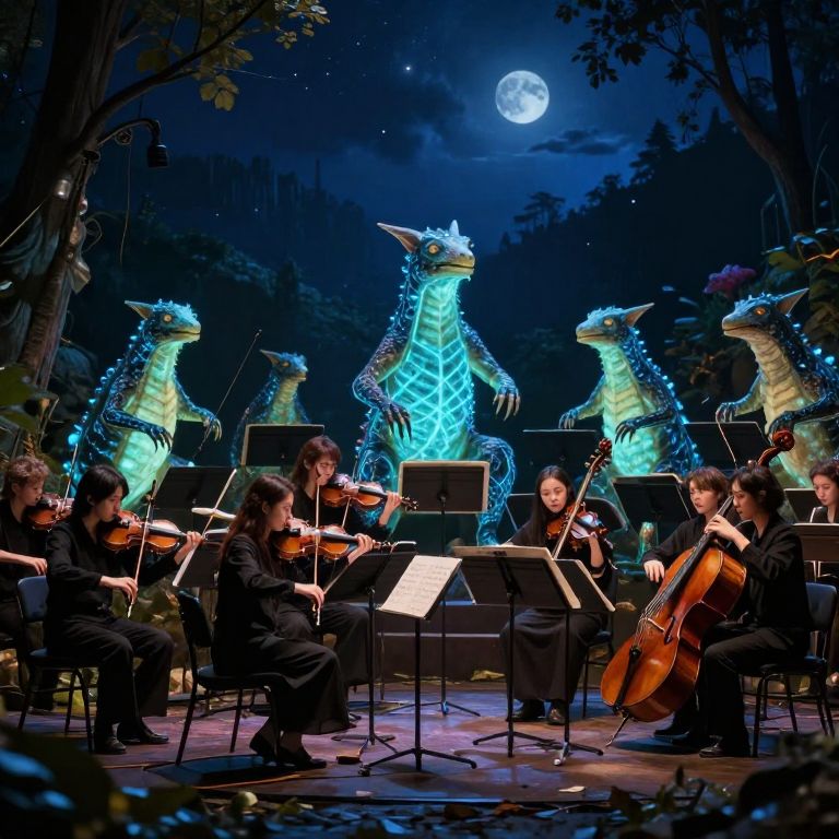 Photograph of a nighttime outdoor concert featuring a symphony orchestra. The musicians, dressed in black formal attire, play a variety of instruments, including violins, cellos, and string basses. The background showcases four glowing, illuminated dragon sculptures with blue and green LED lights, standing tall amidst a forest setting under a moonlit sky. Music stands with sheet music are positioned in front of each musician. The stage is lit with a mix of blue and purple lights, enhancing the mystical atmosphere. The full moon is visible in the dark, starry sky.