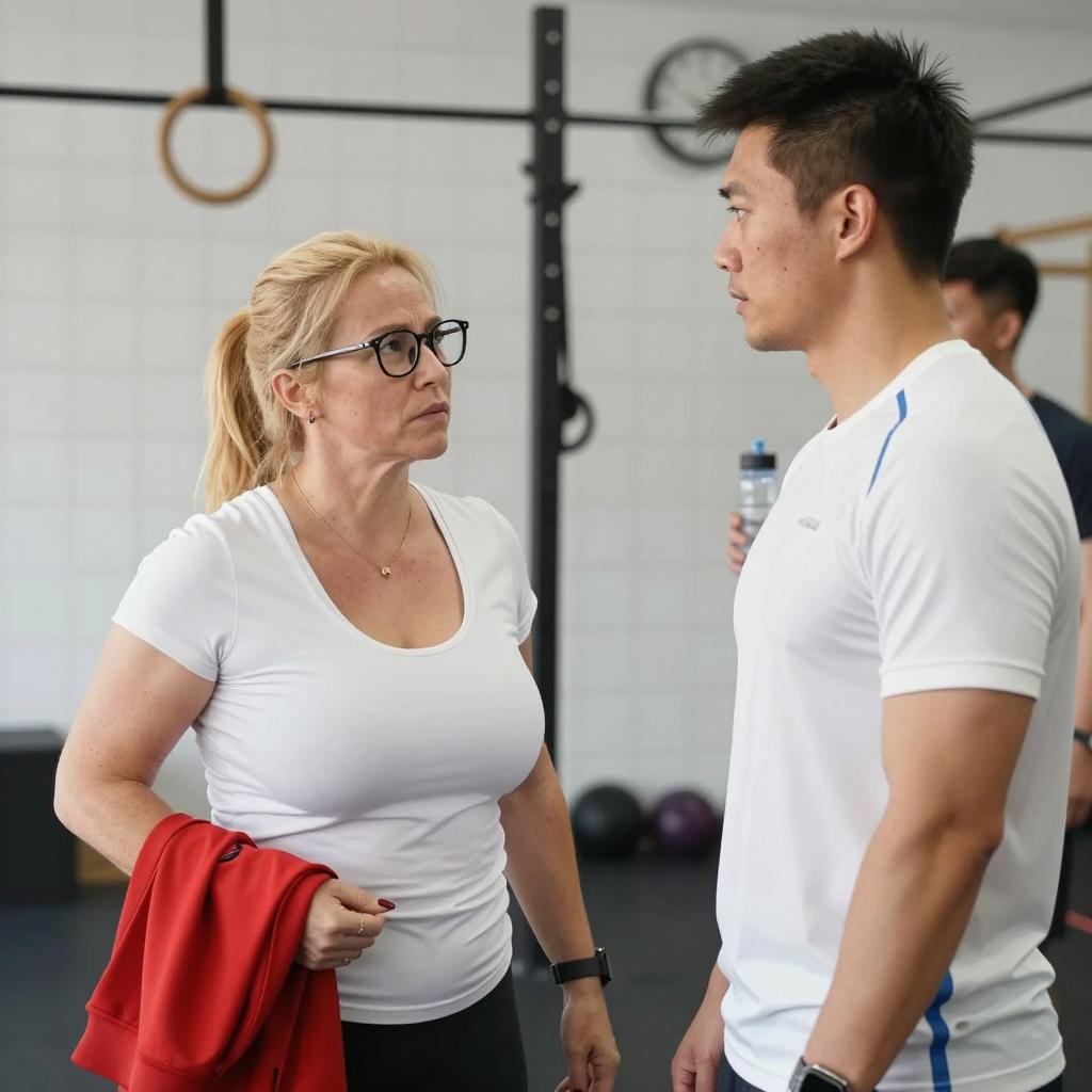 Three men in a dimly lit gym. Bald, muscular man with tribal tattoo in black tank top, gesturing to blond man in light blue shirt. Dark-haired man in black shirt with crossed arms, looks at bald man. Barbell in foreground. Intense expressions.