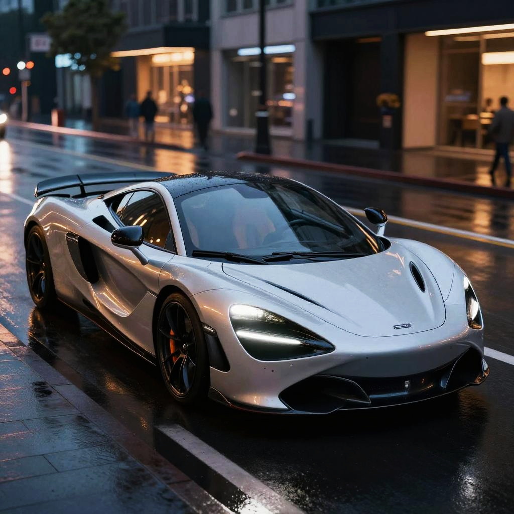 Rainbow McLaren sports car speeding down a neon-lit futuristic city street at night, vibrant multicolored reflections on the sleek body, dynamic motion blur, hyper-realistic details, cinematic atmosphere, high contrast lighting