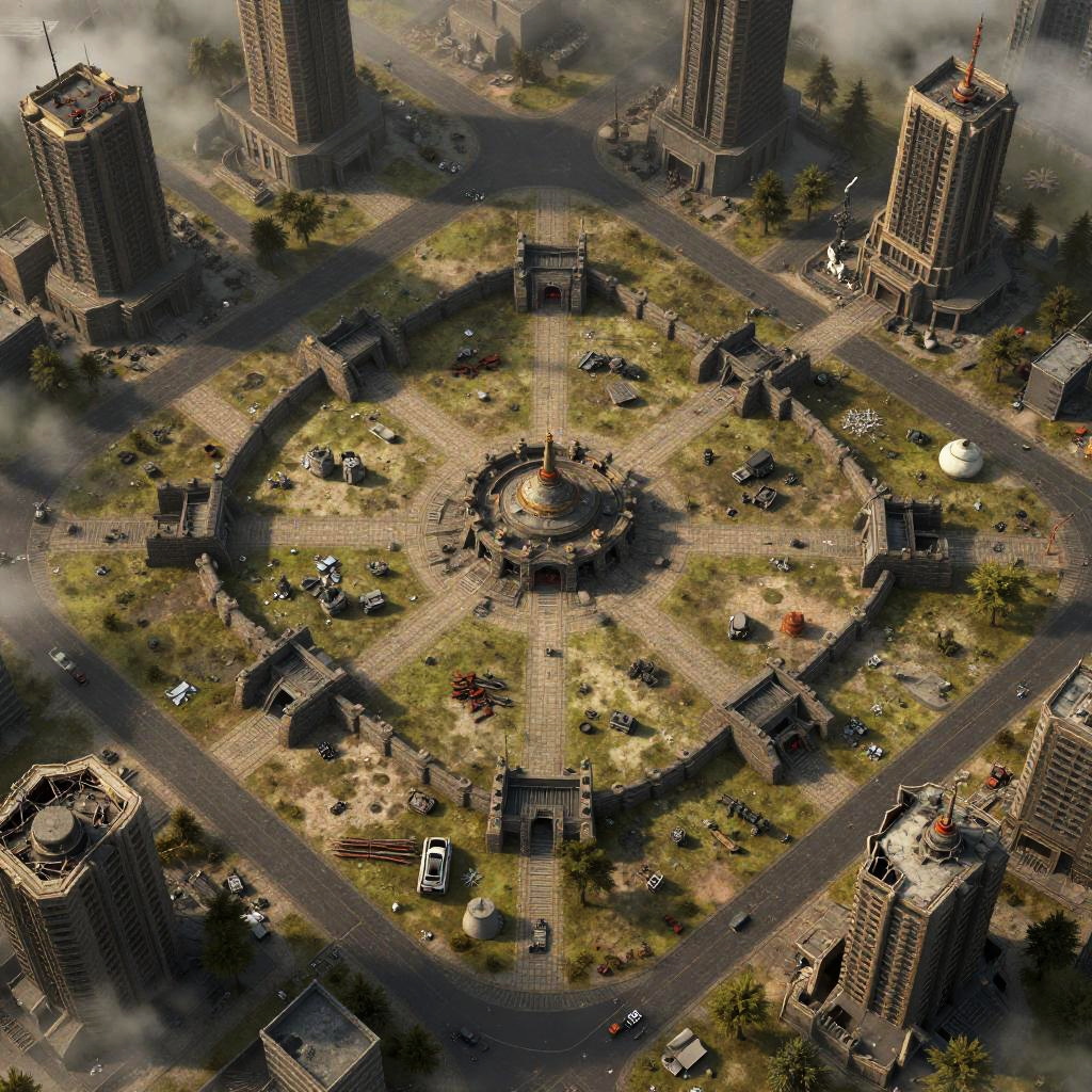 AI battle map generator illustrating a post-apocalyptic battlefield with ruined cities, scattered debris, makeshift fortifications, foggy atmosphere, muted color palette, highly detailed top-down visualization