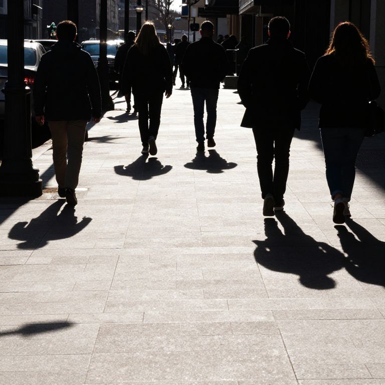 Photograph of silhouetted pedestrians walking on sunlit urban street, casting long shadows on textured pavement, with buildings and cars in background.