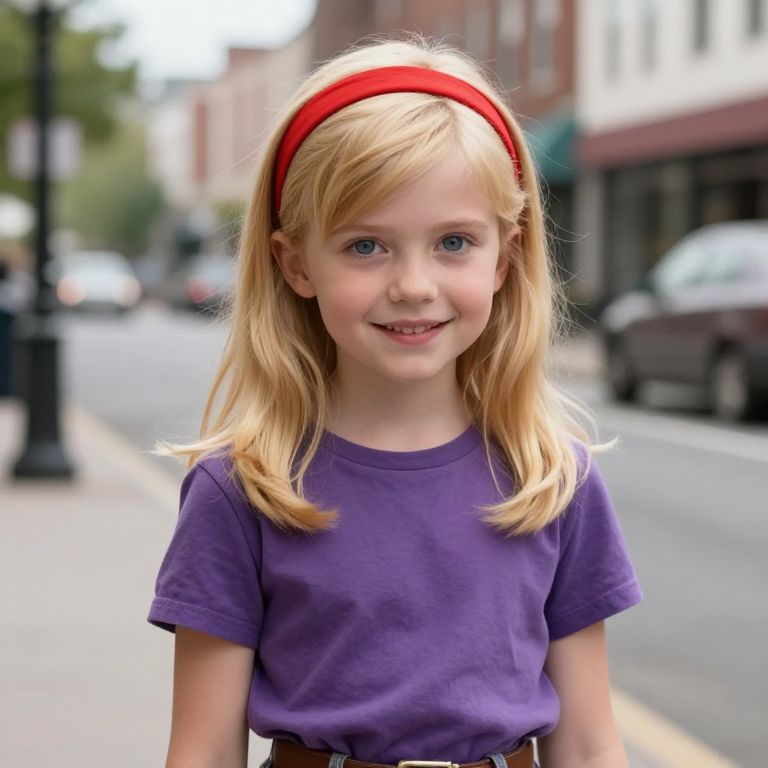 Rosie Revere, blond girl with blue eyes and a red headband standing on a street