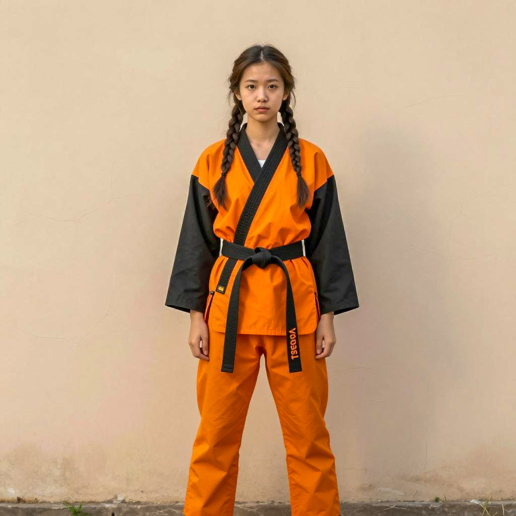 Asian woman with fair skin and straight black hair in a white judo gi with a black belt, holding the belt with both hands. Standing outdoors on grassy ground with trees in the background. Light fills the scene. Photograph.