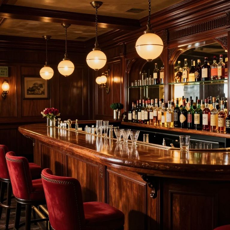 Luxurious, dark-wood bar with red velvet stools, globe pendant lights, glassware-lined counter, and an array of liquor bottles on shelves.