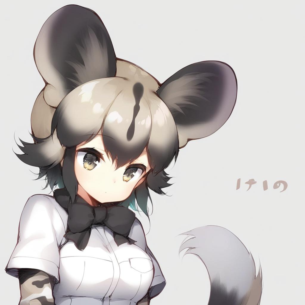 African wild dog (kemono friends), kemono friends, 1girl, dog girl, dog ears, dog tail, extra ears, brown eyes, hair between eyes, short hair, black hair, two-tone hair, brown hair, multicolored hair, grey hair, sidelocks, white shirt, short over long sleeves, by artist senji (tegone spike), leet